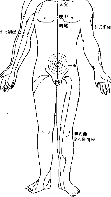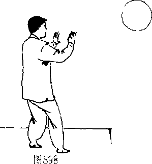 “涌泉”穴由意想太阳之精气源源不断地从“劳宫”穴吸入,通过 双手传至“大突”穴,由天突向下送至丹田,随“玉津液”并吞 咽而下,下腹更为充实口(图S98)