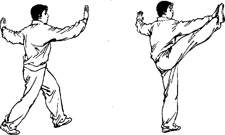 2,左脚向前半步,身体重心前移,上体半向左转。同时右 手稍向上举。眼看前方(图135)。