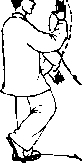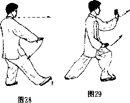 (8)重心移向右腿,右脚掌落平.屈膝成右弓步; 同时右手经右膝前上方向右平搂至膝外侧,掌心朝 下,掌指朝前;左掌向前推出,掌心朝前,掌指向上,眼 看左手方向(图29)。(结束动作定势朝东。)