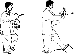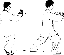 在第五分动,右掌握拳落压与左拳冲出要同时, 左拳不得超过右脚尖。