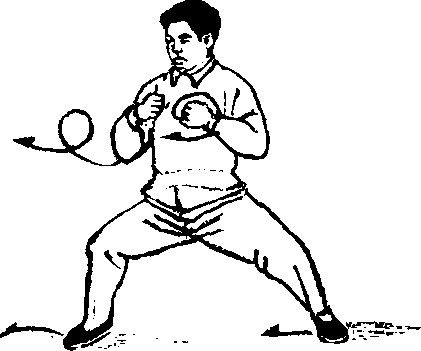本式主要是在骑马式的裆口下,双拳搠劲十足地在胸前 翻转,做一个上下里外的顺缠圈,揉动脊背,以锻炼气由脊 发的功夫。做此式时,并立的双腿也要里外缠转,要表现出 劲起于脚根、达于拳尖的神态。这是校正动作、达到正确姿 势的一个拳式。