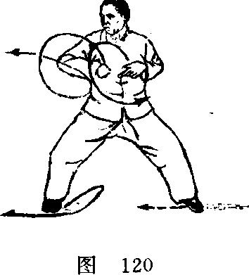 动作:这是继续上式“顺鸾肘”两肘下沉发劲后,以左 拳护胸,用右肘尖逆缠一小圈,向右侧展开步法以击出。右 足沿地面铲进,左足在后跟着前进。右足在前为虚。但当发 肘劲时,右足立即变实。(图120)