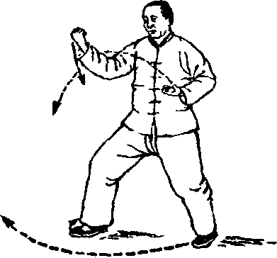 旋转中轴向右带转180。,左足亦随之弧转到右足的东侧。当 胸转到南面时,双拳在胸前作里外上下的顺缠,如风车式弯 臂旋转一个圈。当右拳翻向内上时,右足为实。(图122)当 右拳翻向外下和左拳翻向内上时,左足为实。(图123)