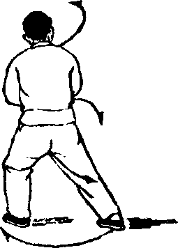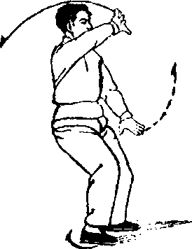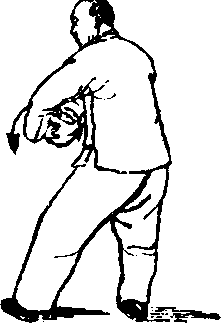 凡手臂越出方圆圈外,就叫做出隅;越进方圆圈内,就 叫做进隅。出隅须用采捌,进隅须用肘靠。所以肘靠之用,犹 如短兵相接,速战速决,没有回环的余地。为此,须有连珠 为用的措施,以求得最后的解脱。此式就是这一措施的继续。 当右手仍然不得脱的时候,顺着要劲,右足沿地面铲进,右 肘向右击出,同时左足后随地一震脚,这是形成如弓弦脱扣