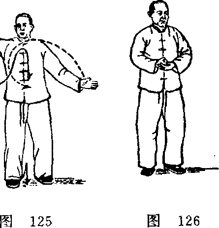 左上。同时左掌亦以逆缠从左上向右下按劲,与右掌相合于 小腹前。(图124)接着,左掌按住一点逆缠转左后,重心仍 于左足;右掌随之顺缠向上一开劲,以带转身躯再向右转 90。。此时仍以左足为旋转中轴。(图125)