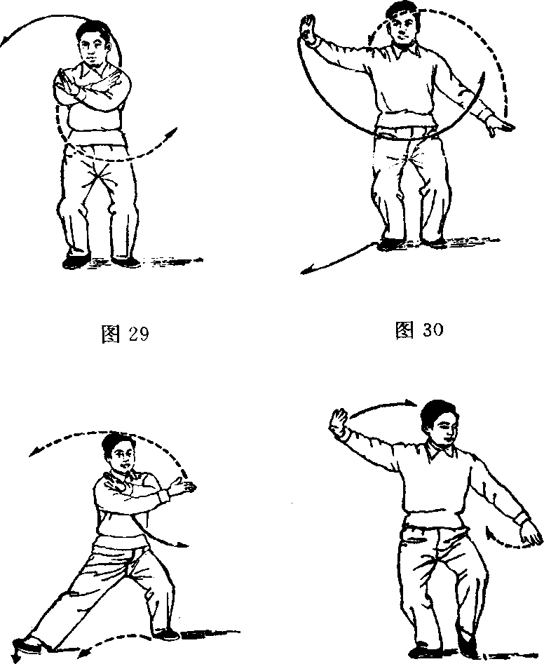 动作二:随着右脚向右侧迈出,接着重心移于右腿,左 脚向右脚靠拢,以脚尖虚点于右脚旁;在重心右移的同时,两 手均逆缠,右手向右上、左手向左下弧形分开。(图32至该 式所有动作都应朝着正东方向而做,自图29 — 32四幅中所示 皆其正面)