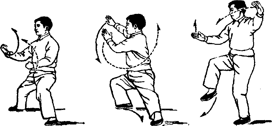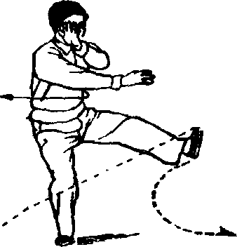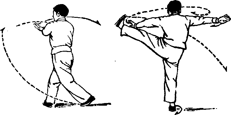 是直着腿横转过来);左腿落实后,提起右脚横着脚跟蹬出。 其不同点,是去掉横扫的劲,改变为踢脚和蹬脚两个动作。