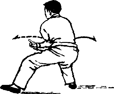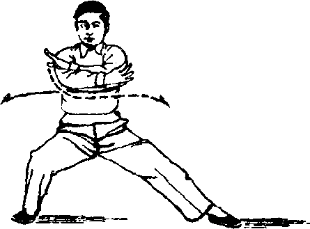 动作一:身微左转,重心左移,左腿微弓。同时左手顺缠向 左下翻至左腹前,拳心朝上;右手顺缠微向右前翻至腹前,拳 心朝里上。(图155,此图中两脚所踏处仍如上图原地未动,胸 部仍朝东,由胸部朝东方向开始此式动作)身体右转,重心右