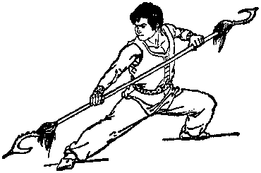 预备势:甲持棍、乙持三叉扒头