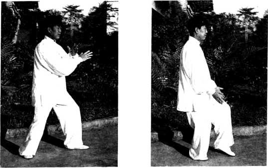 距尺许(如图34 — 1)。两臂分开,搂挟托膝上抬,右腿
