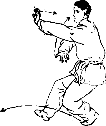 动作要领接上述(十三)动作,右脚向左前上步,脚尖外摆,两腿屈膝半蹲,右掌以掌心为力 点屈臂下按置腹前,随之身体 右转.左掌掌心空圆型以掌指 为力点猛力向前插出,目视左掌(图 6—51 ) o要求*左掌插戳要借助催 肩、转体的力量。用途8插击胸、腹、裆部。实战说明,当敌拳攻击我胸 或腹部时,我右掌随之下按敌臂 防开攻击,随之左掌迅猛向敌腹 或胸部插戳。