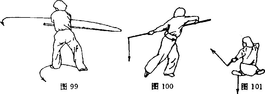 ②以左脚为轴,身体继续左后转,右脚尖贴地随转体滑转; 同时,双手持棍随转体向左平拨,左手向棍梢方向滑握使棍身横 于腰前(图100)。