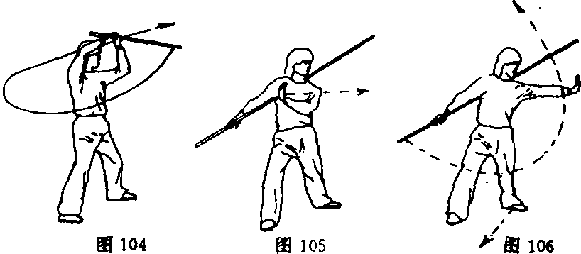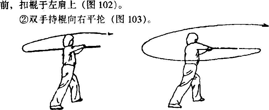 ③重心移至两脚之间;双手持棍向右平抡一周(图104)。