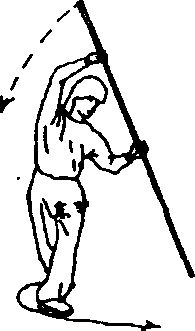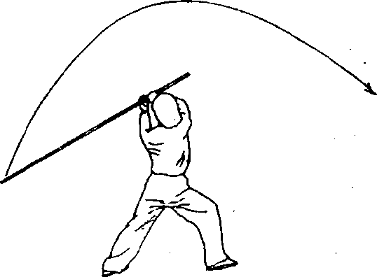 撩棍前,肩、胸充分舒展,身体向右拧转蓄劲;撩棍时,迅 速向左拧腰发力,撩棍幅度要大,右臂要上提,以免棍梢触地。