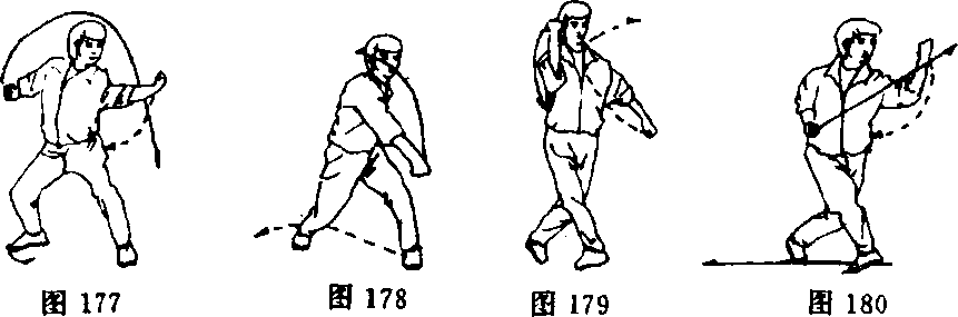 ②重心稍后移,左脚向右脚后插步,脚掌着地,同时腰微右 转;右臂屈肘外旋,右拳绕经面前向右格挡,拳心朝里,左拳稍 向前移;目视右拳(图179)。