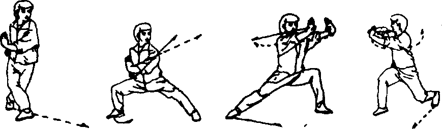 左右脚,尽量向右斜后方,即场地的右侧退步,注意手、 眼、步的配合,提神降气,收腹敛臀。