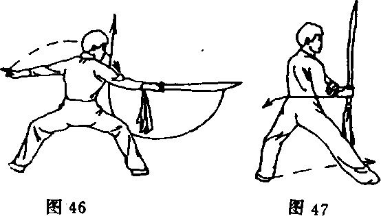 ①上体右转;右手心向下,刀身放平,左手直臂向左平分; 目视右方(图46)O