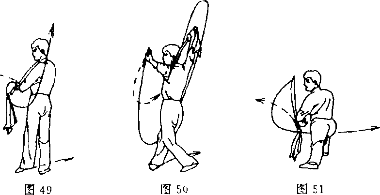 ③右脚向右迈步成右弓步;右手持刀向右、向下绕行,至左 腿前时向左侧崩起,刀尖斜向左上方,左手屈肘按于右手腕上; 目先视右侧,后视右前方(图51)。