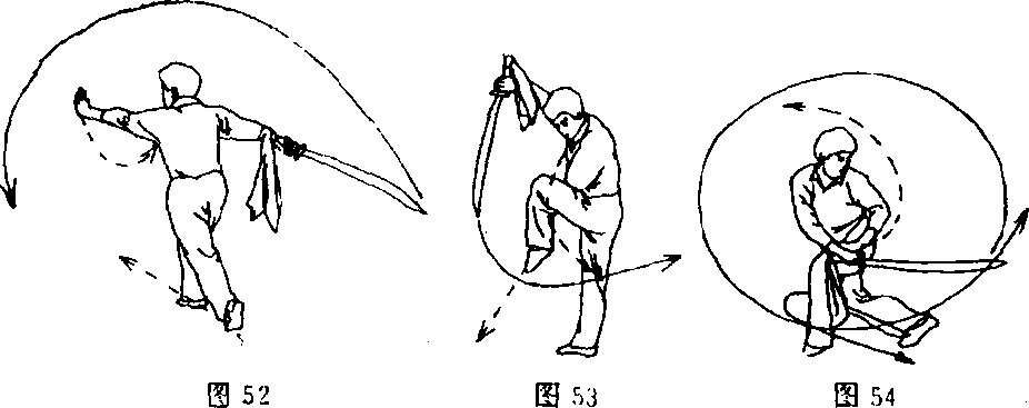 ①身体右转,左脚跟抬起;右手持刀向前、向下经右腿外侧 向后绕行,臂与刀成一直线,刀刃向上,左手向前立掌推出;目 视左前方(图52)。