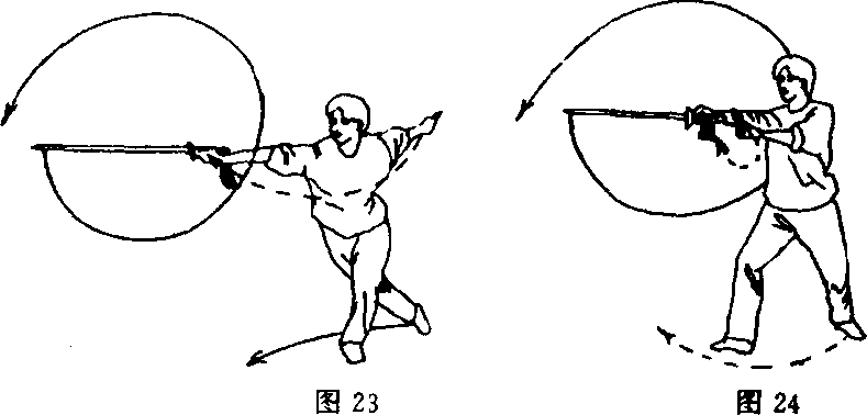 腿伸直,脚跟抬起;右手握剑向前反撩,剑尖稍高于肩,虎口向 下,左剑指下落经腹前向后举起,与肩同高,手心向下;目视剑 尖(图23)。