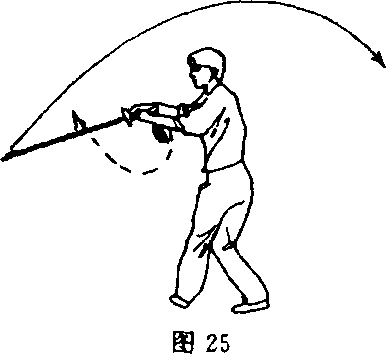 ②上体右转;左脚向右前 方上步,脚尖内扣,膝关节稍 屈;右手握剑,以腕为轴,向 下经体侧向前点剑,剑尖与腰 同高,肘微屈,虎口向上,左 剑指向下、向上划一小弧附于 右腕处;目视左前方(图 25)。