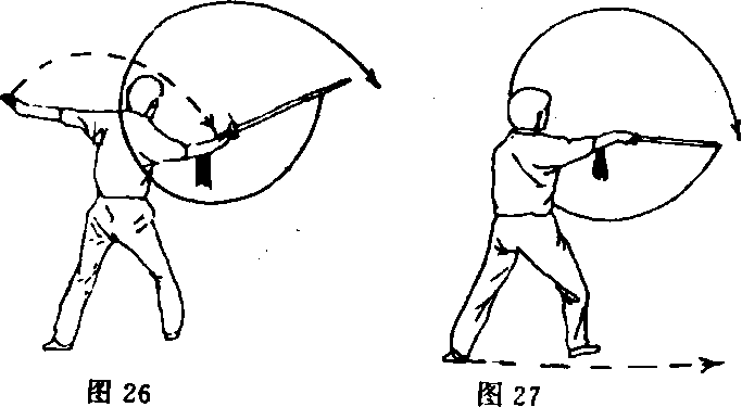 ②右手握剑,以腕为轴, 向下经体右侧向前划一立圆, 与肩同高,虎口向上,左剑指 向上、向前划弧附于右腕处; 目视前方(图27)。