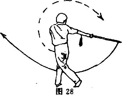 下经体前向上划一立圆,剑尖与腰同高,虎口向上,左剑指收于 右胸前;目视右前方(图28)。