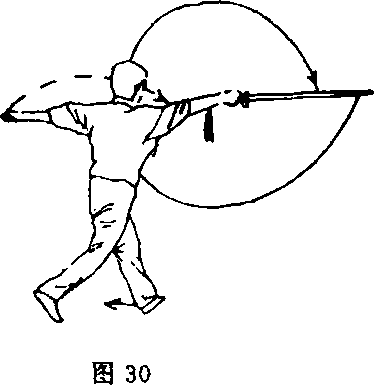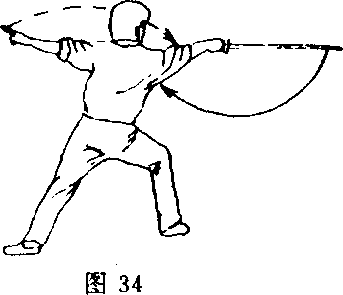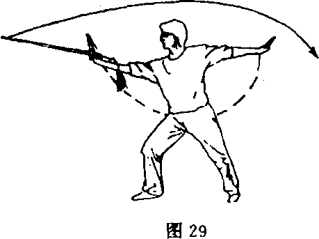 ①上体左转约180度;右脚跟、左脚掌向左碾转,左脚落 地,左腿伸直;右手握剑向下、向前撩剑,小指侧剑刃朝上,剑 尖与鼻同高,左剑指向下经体前向上划弧于体后,与肩同高,手 心斜向下;目视剑尖(图29)。