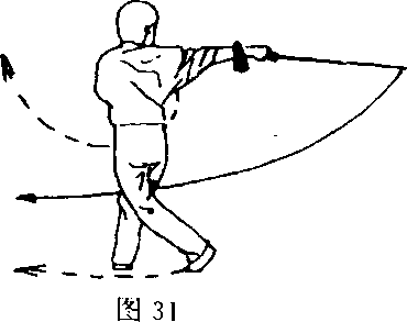 ③上体左转;随转体右脚 经左脚内侧向左盖步,屈膝, 脚尖外撇,左脚跟抬起;右手 握剑,以腕为轴,向下经体前 向上划一立圆,与肩同高,左 肩指向上屈肘收于右胸前,指 尖朝上;目视右前方(图31)。