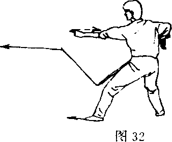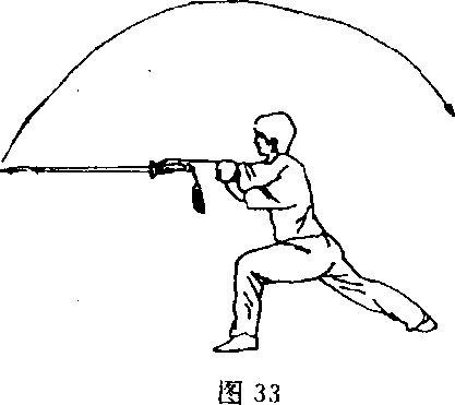 ⑤左脚稍向前活步成弓步;右手握剑前剌,与肩同高,虎口 向上,左剑指屈肘回收于右胸前,指尖朝上;目视前方(图 33)。