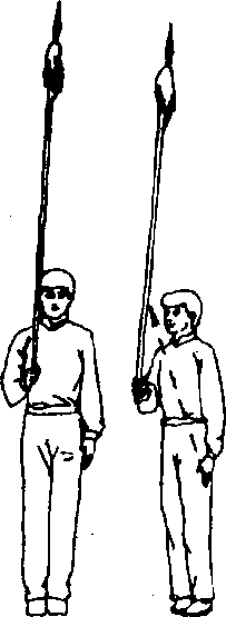 并步立于场地右侧,随后身体略右转; 右手握把持枪置于右胸前,左手垂于体侧; 目视前方(图1、2)o