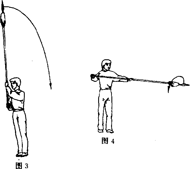 ①左手上举握枪身中段,随身体左转,左手引枪下落,枪尖 朝前下方;右手握把收于腰右侧(图3、4、5)o