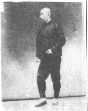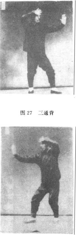 图28三通背一式图28三通背一式直竖起.又将左手虎口朝上着. 同时于胁下往前伸直.手虎口仍 朝上着.与心口相平。左足与两 手同时,极力往前迈去.两足相 离之远近,随人之高矮.总要两 腿弯曲着.不移动重心为至善 处。两眼顺着左手食指梢看去. 将神气沉住?且内外开合须要分 明。虚实动睁,务要清楚.不可 有一毫之混淆.使内中之神气散 乱不整耳(见图27)。