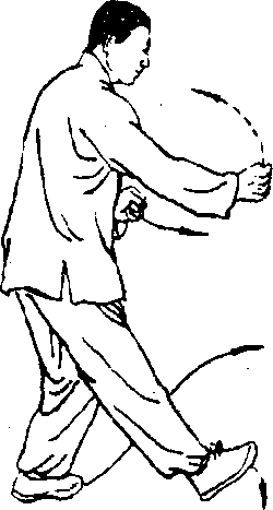 (2) 左腿膝部内翻,左脚在空中由下向左、向上、向右划一 小圆,屈膝扣腿,以右脚掌为轴,转左转45。,眼看左方。(图 116)
