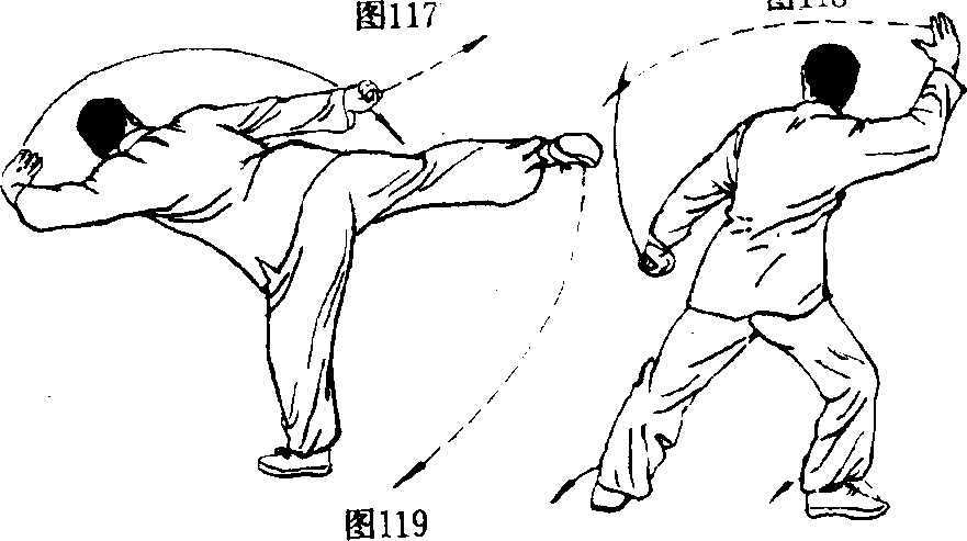 (6)右腿一点,即迅速屈膝收回,右脚在左脚前落步。(图(6)右腿一点,即迅速屈膝收回,右脚在左脚前落步。(图图120图120