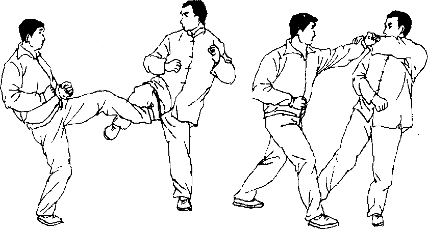 (2) 左脚勾拉与右脚蹬踢要同时完成,形成挫劲。