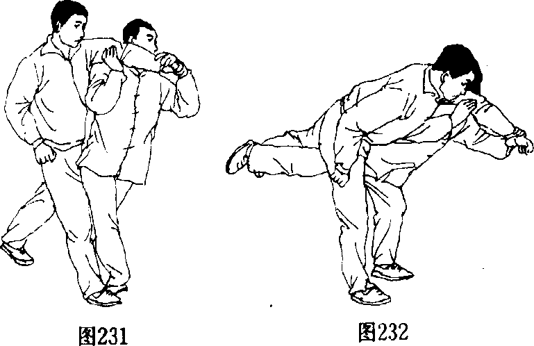 然后,甲方快速左转身,右腿插入乙方裆部,右肩贴紧乙 左肩,猛力弯腰,双手用力向下拽乙臂,同时用右腿绞挑乙方 大腿或裆部。(图232)