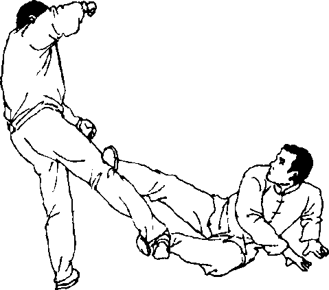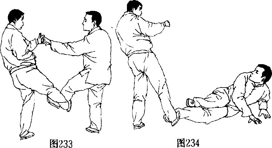 甲方左三体势站立,乙方右脚勾扫甲方左脚。(图233)
