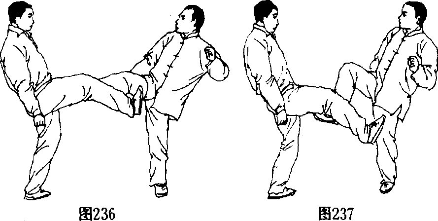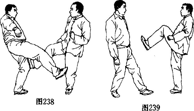 并顺势蹬踢乙左膝关节(或散关节),脚尖上勾,力贯脚 跟。(图238)