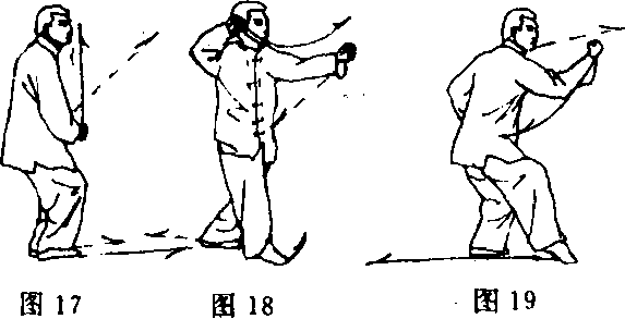 ①左脚向后退半步,上体左转,随即右脚后撤半步,脚跟提 起,脚尖点地,两腿屈膝半蹲成右虚步;同时,左拳内旋,收抱 于腰侧,拳心向上,右拳外旋屈肘向身前掩裹,使拳心翻转向 上,高与口齐;目视右拳(图19)。
