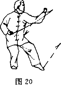 ②右脚向后撤一步,随之身体向右转体约180度,左脚后退 半步,脚尖虚点地面,两腿屈膝成左虚步;同时,右拳回撤于右 腰侧,拳心向上,左拳从左侧向身前屈肘掩裹,使拳心外旋翻转 向上,高与口齐;目视前方(图20)。