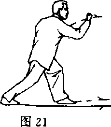左脚向左前方上一步,右脚跟进半步,两腿微屈,重心略偏 于左腿;同时,右臂外旋从左臂里侧经胸部,口前上钻,拳心向 里,高与鼻齐,左拳同时内旋,拳心向下,停于腹前,拇指紧靠 肚脐处;目视右拳(图21)。