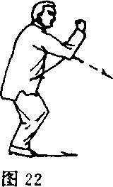 ①左脚向左前方上半步,右脚随即上步与左脚靠拢,脚尖微点 地面,两腿屈膝半蹲;同时,右臂外旋,拳变掌向下、向怀中抓握,至 腹部时再握拳,臂外旋使拳心向上,经胸部,口前上钻,拳高与鼻尖 齐;左拳拳心翻转向匕仍停于原处;目视右拳(图22)。