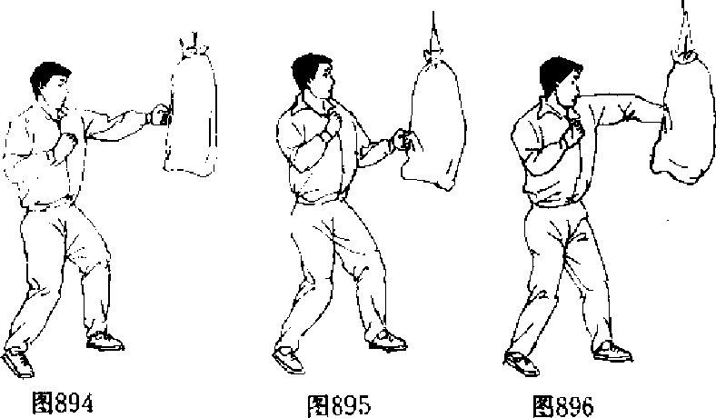 I动作说明】以左格斗势为例。左脚在前,右脚在后,两 脚距离比肩稍宽,同时屈膝,右脚跟抬起,重心偏左,身体微前 倾,两手自然放松,垂腕屈肘于胸前,左手在前,右手在后,头 徽前勾,眼视沙袋,以冲拳、摆拳、勾拳等拳法交替击打沙袋 (图 894、图 895、图 896),