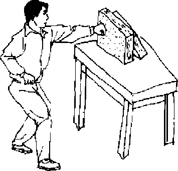 用麻石或其它石料制成一块长约50厘米,宽约25厘米, 厚约15厘米的平面石板,侧横卧于一张木桌(或台子)上,石 板的后面可用重石块或重物顶住,使其在击打时不倒。