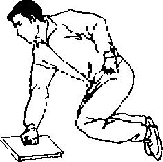 【动作说明】两膝下跪于铁板前,相距与肩同宽,两手抱 拳于腰间,身体向下弯曲'头略下俯,先用左手拳面向下直击 铁板,接着收回原处,再用右手拳面向下直击铁板(图898摭