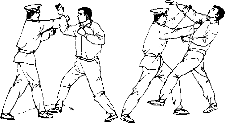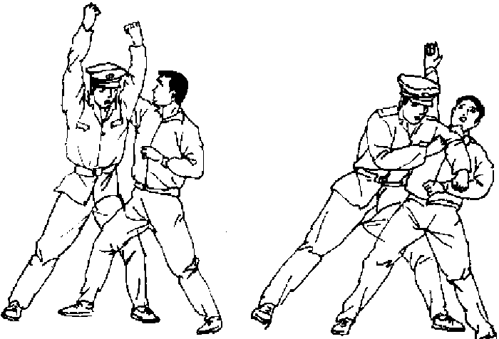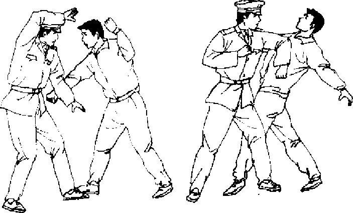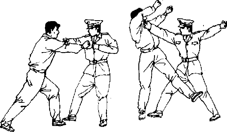 【动作说明】敌我对峙。敌向前上右步,同时用右拳向我 面部击来,我迅速甩腰右闪,同时拧身上左步,至敌身右后(图 59。),借前冲之劲双臂向左斜下砸打,上下合劲,将敌跌翻(图 591).