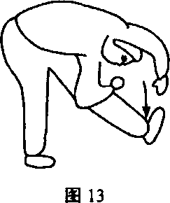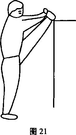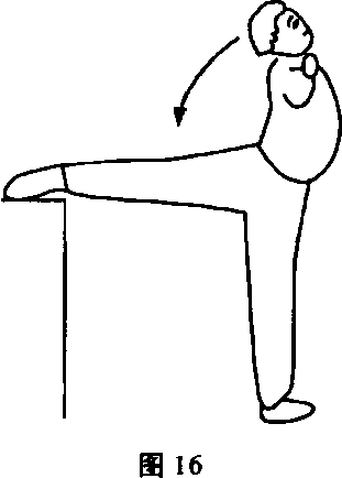动作说明:背向支撑物,右脚背向下,放至与腰同高的支撑物 上,两手叉腰或左右平伸,两腿和腰尽量伸直,胸挺起,动作时,甑 部松沉向下振压,用头部尽量碰脚(图16)。左右腿互换练习。