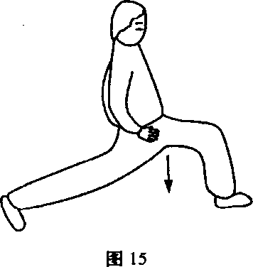 动作说明:两脚左前右后错步站,左腿屈膝下蹲,右腿伸直,前 脚掌着地,步幅大于弓步,右手扶右大腿,左手置于臀部。动作时, 左腿尽量屈膝,髓关节放松下沉振压,同时左右手用力向下压臀与 腿(图15)。左右腿互换练习。