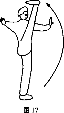 踢,腿到极限后,借回弹之力下落至体前落地,略上一步,左脚尖勾 起向前额踢起,也可原地练习,但上步可借惯性使踢腿更轻快(图 17)0